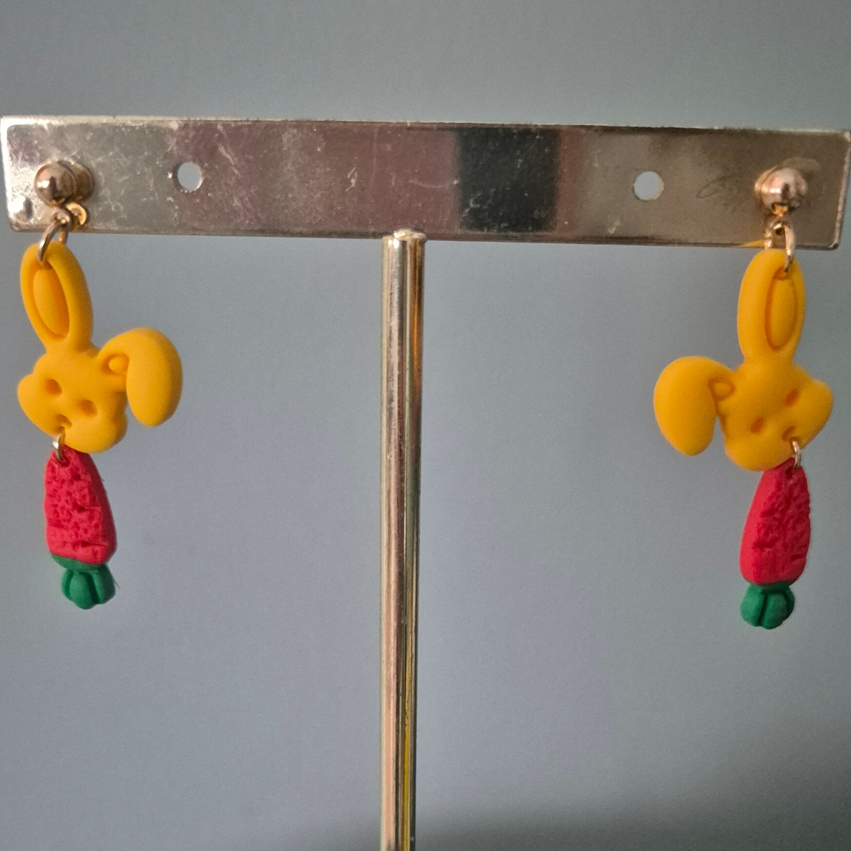 Vrolijke oorbellen met een schattig paaskonijntje en kleurrijke wortel.